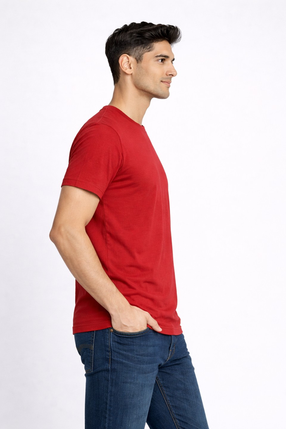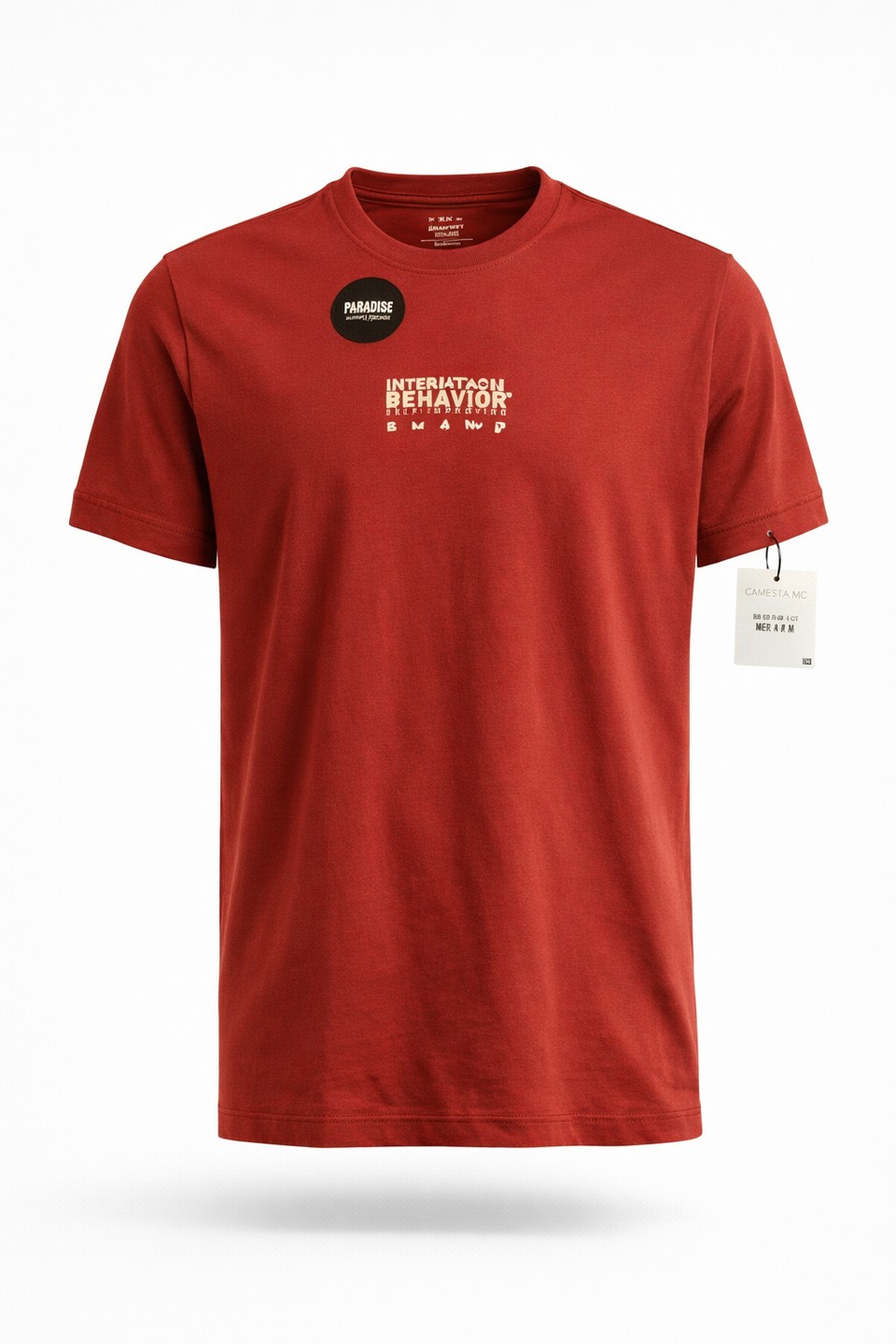 Camiseta de hombre manga corta en color rojo, con diseño estampado frontal y estilo moderno. Ideal para un look casual cómodo y con personalidad.