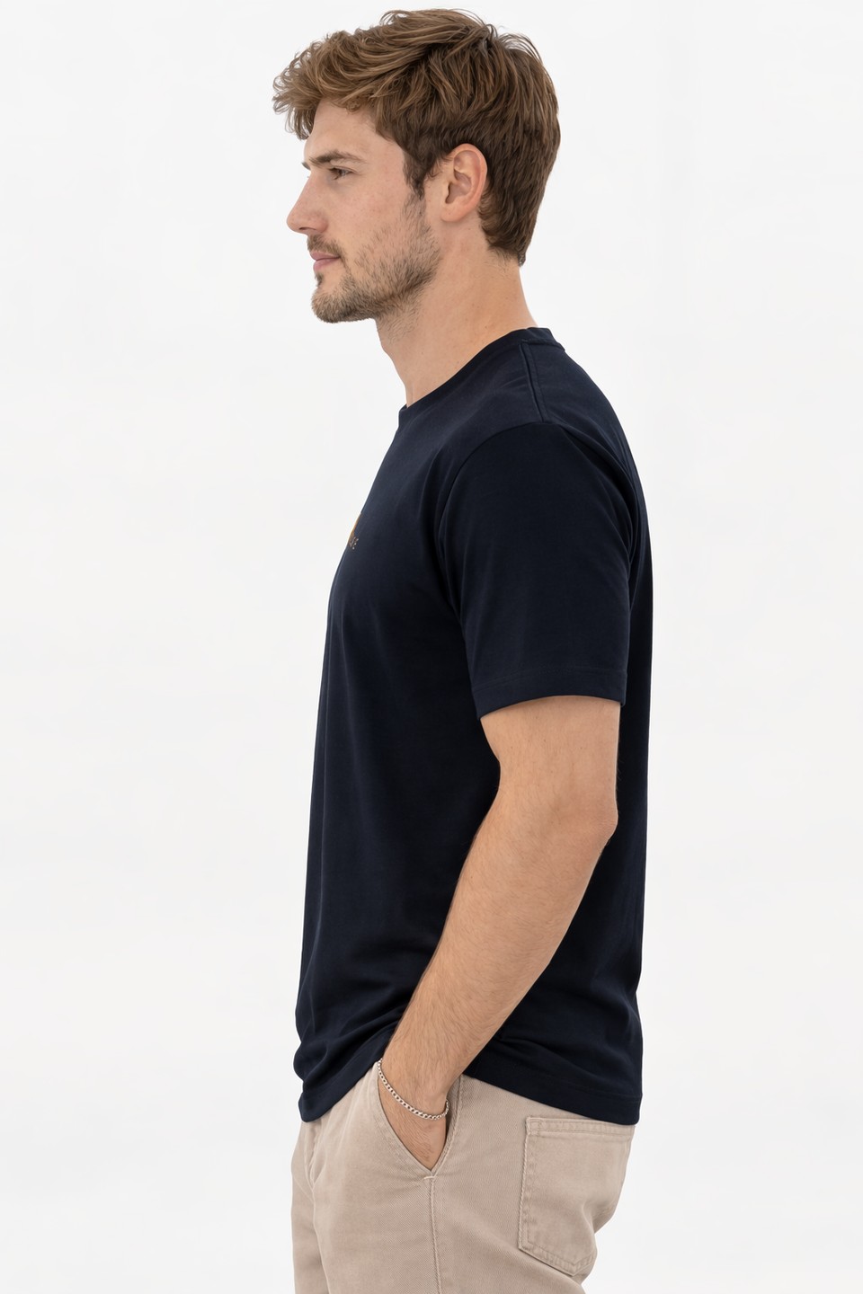 Renueva tu estilo diario con este Polo Light House para hombre, diseñada para ofrecer comodidad y versatilidad en cualquier ocasion. Su confeccion en tejido tipo silk proporciona una sensacion suave al tacto, ligera y fresca, ideal para el uso prolongado durante el dia. El diseno en color azul oscuro aporta un estilo sobrio y moderno, facil de combinar con jeans, bermudas o pantalones casuales. Ademas, cuenta con un estampado frontal discreto Light House que anade un toque distintivo sin perder elegancia. Su corte clasico con cuello redondo y manga corta garantiza un ajuste comodo que se adapta al cuerpo, convirtiendola en una prenda esencial para el dia a dia.